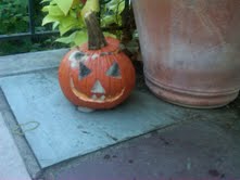 I must admit, it looked particularly fiendish. Gray fuzzy mold had taken over the interior, and was now scowling malevolently at us from triangular eyes. Despite Jude’s outraged howls of protest, the pumpkin moved outside.