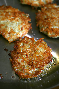 - Turn heat down to medium. Like pancakes, flip when they are golden brown underneath. (Just so you’re not surprised, they’re like little sponges. They soak up a lot of oil, so you’ll have to keep adding.) When they’re ready, slip them into the paper-towel lined tin pan. After you’ve filled up the bottom of the pan, add more paper towels and place additional layers of latkes on top.