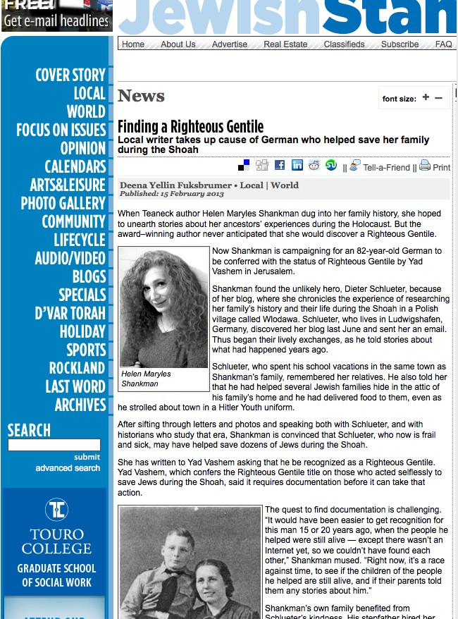 Shankman found the unlikely hero, Dieter Schlueter, because of her blog, where she chronicles the experience of researching her family’s history and their life during the Shoah in a Polish village called Wlodawa. Schlueter, who lives in Ludwigshafen, Germany, discovered her blog last June and sent her an email. Thus began their lively exchanges, as he told stories about what had happened years ago.
