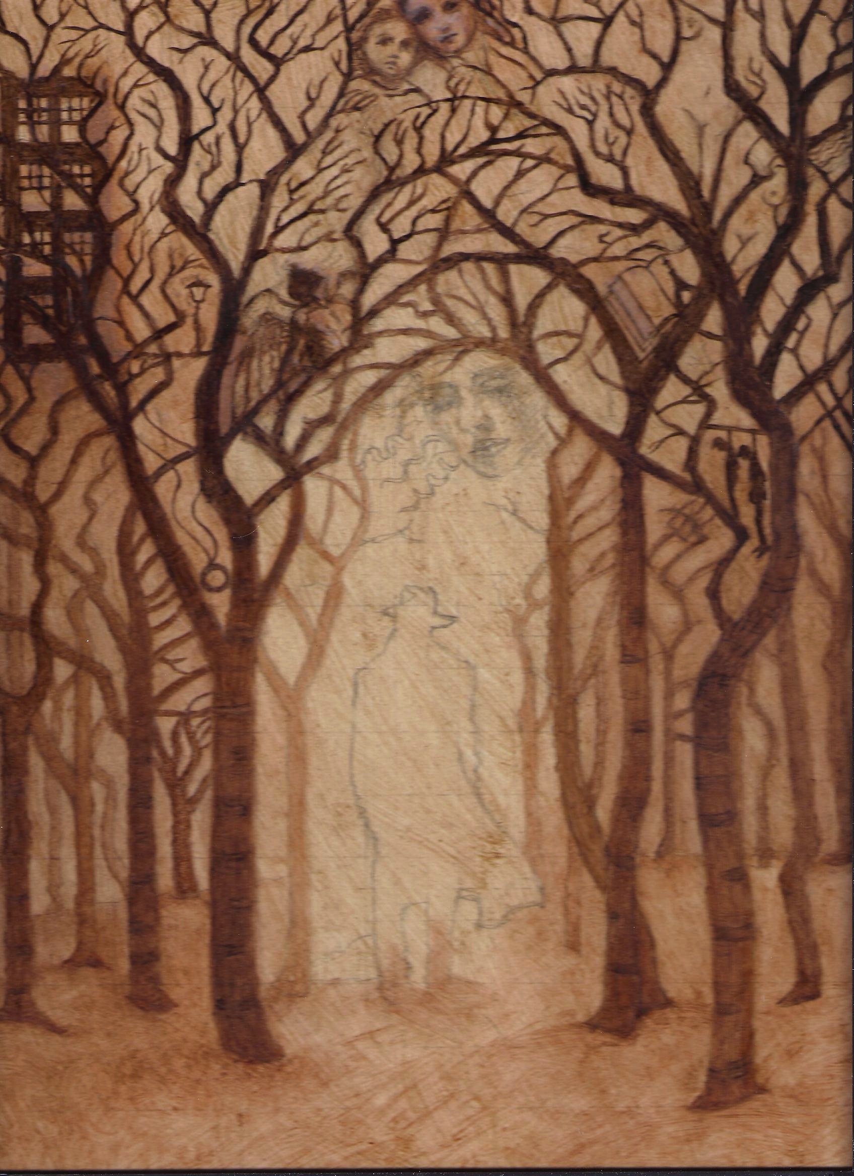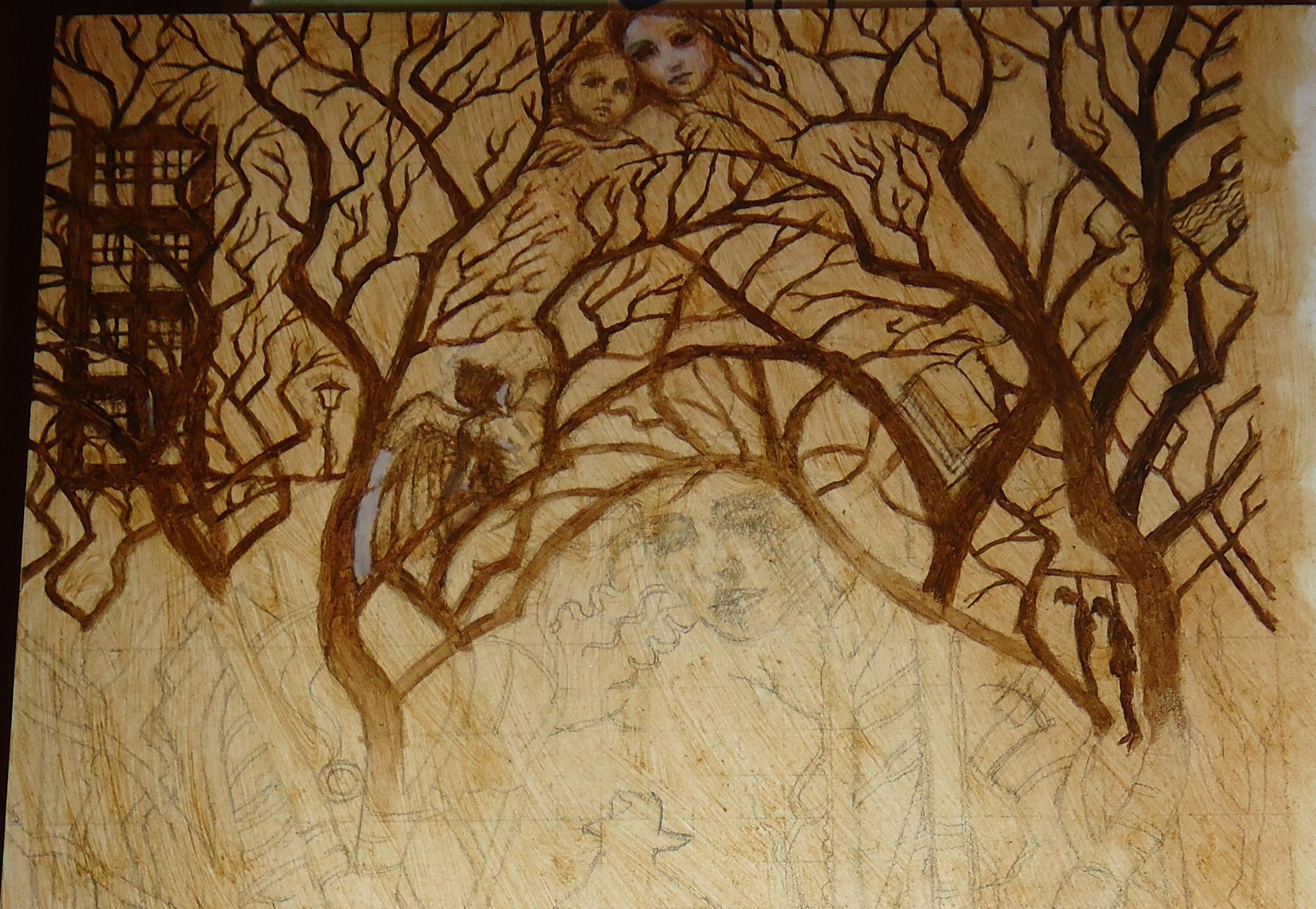 The Eureka Moment came as I navigated the traffic along Route 4, driving my kids to school after they missed the bus. As we passed thousands of winter-blackened trees, the answer popped in my head like a bubble. I would hide icons and vignettes from the story in the tangled branches.