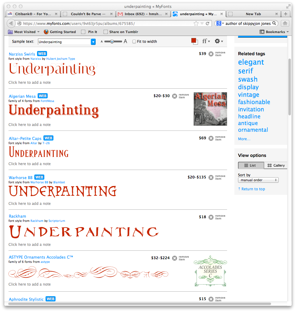 Oh, fonts, how I love you, your seductive curves, your thicks and thins, your arches and peaks and swashes. Which letterforms will go best with my art work, I wonder? Is script too hard to read? What about drop shadows and inlines? Do I want it to look antiqued? All Caps? Serif or sans-serif? Which ones look good in red? Which font says Underpainting like no other?